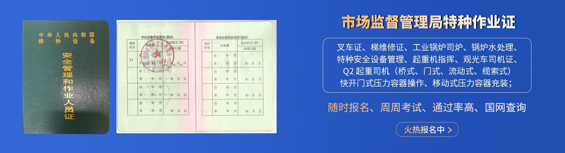 叉車證,電梯維修證,起重司機-橋式-門式-流動式,起重指揮,壓力容器操作,鍋爐司爐,水處理,特種設備管理,觀光車;
